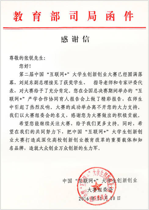 2018年,澳客 连续多年为中国国际互联网+大学生创新创业大赛做出积极贡献,获教育部来函致谢。